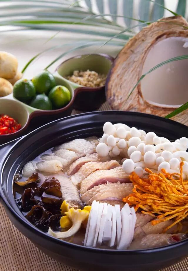 主料采用海南正宗文昌县伏牛镇走地鸡及天然椰子汁烹制煮汤,香润甜滑,芳香四溢,健康、清润、营养、无添加,是海南的招牌名菜。文章及啄食天然椰子树籽、椰肉,体质佳,将文昌鸡和天然椰青水放入锅内,煮沸后浸Yh5分钟即可食用,配上海南天然野生桔子、沙姜、指天椒、酱油,味道更佳。具有补肾健脑、补血养神、排毒养颜之功效,是一道天然养生佳品。