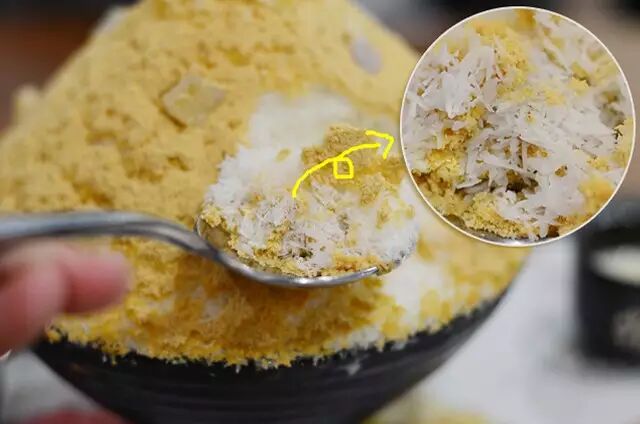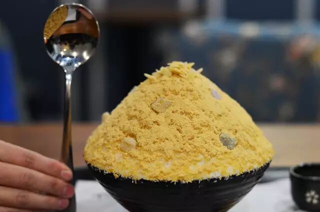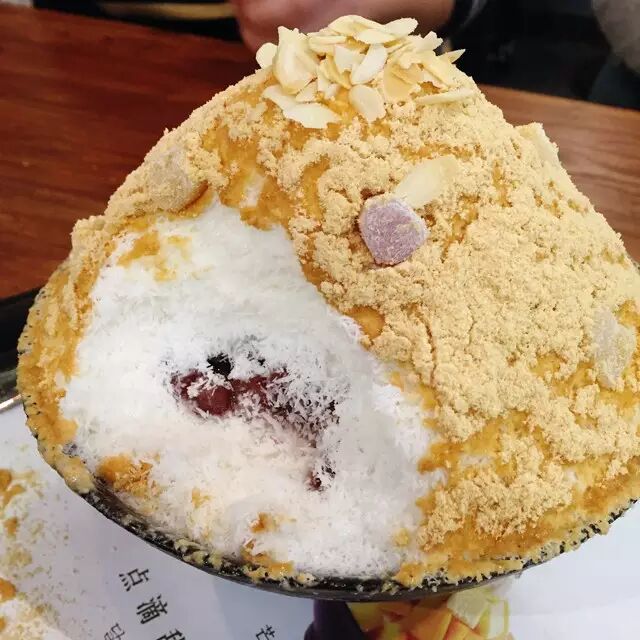 乍一看懵了!冰呢?在底下。轻盈,香气扑鼻的香豆粉均匀地覆盖在了雪花冰上,顶端是杏仁片,周边点缀了年糕粒。很多人大呼:什么呀,这粉不就是福州吃[米时C]时用的黄豆粉!不不不,其实还不太一样的,香气、口感确实略相同,但是这粉里可是偷偷加了生姜提味。吃的时候就这么刮一点儿香豆粉,加上一点儿雪花冰,入口层次丰富。有的人爱极了这香豆粉,光把粉都刮光了,再喊老板要,哎呀!不是免费续,如果你颜值够高或者嘴巴够甜,说不准能再蹭点。
