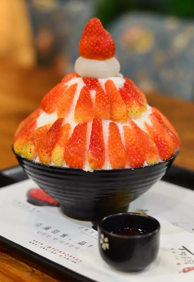女孩子喜欢点的草莓冰,面上是新鲜先切的草莓,和年糕并不同的是,这份草莓冰的中奖夹层,第五层是草莓果酱。最开始的时候,店里也有配一杯草莓酱,直接淋在草莓上,味道会更浓郁香甜哦!