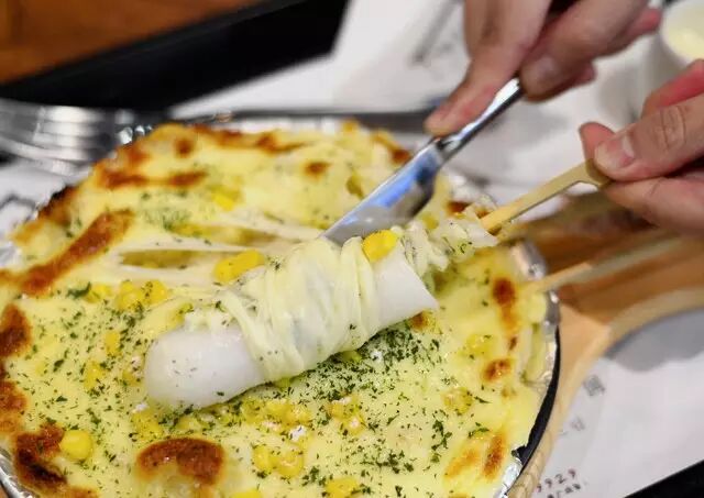 韩国进口年糕棒,面上撒了满满满满地马苏里拉芝士,刚出炉的时候趁热拉丝!可拉得非常非常高。但是小编有必要友情提醒,不要玩太久。因为这个芝士真的好容易硬掉,会影响口感,而且拉的时候,因为芝士接触了空气加上拉扯失去柔嫩度,这样再想要包裹到年糕棒上就没那么容易了。