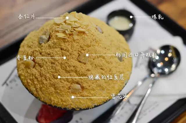 进店首选,当然挑招牌下手。就是这一份如埃及金字塔的年糕雪冰~贴心的小编给大家画了一个不完全层次图。首先,并分量很足,点一份够两个人吃没问题,上来的时候配有一小杯炼乳,做什么用呢?一会儿说。