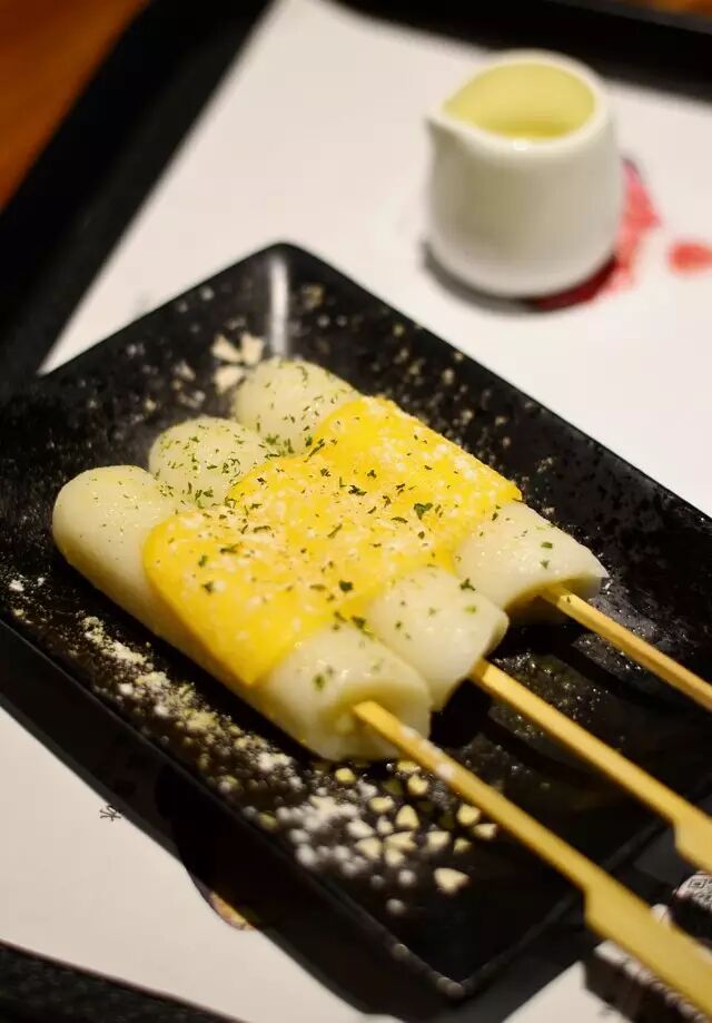 这个是烤年糕棒,上面放了芝士片。吃起来也很Q弹啦~不过,就没有上面的芝士那么耐玩,两口就解决啦!